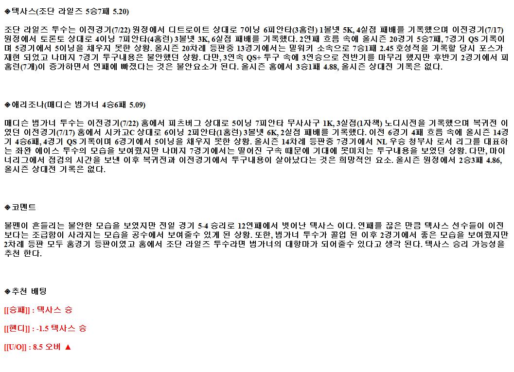 2021년7월29일 애리조나 다이아몬드백스 텍사스 레인저스 해외야구중계