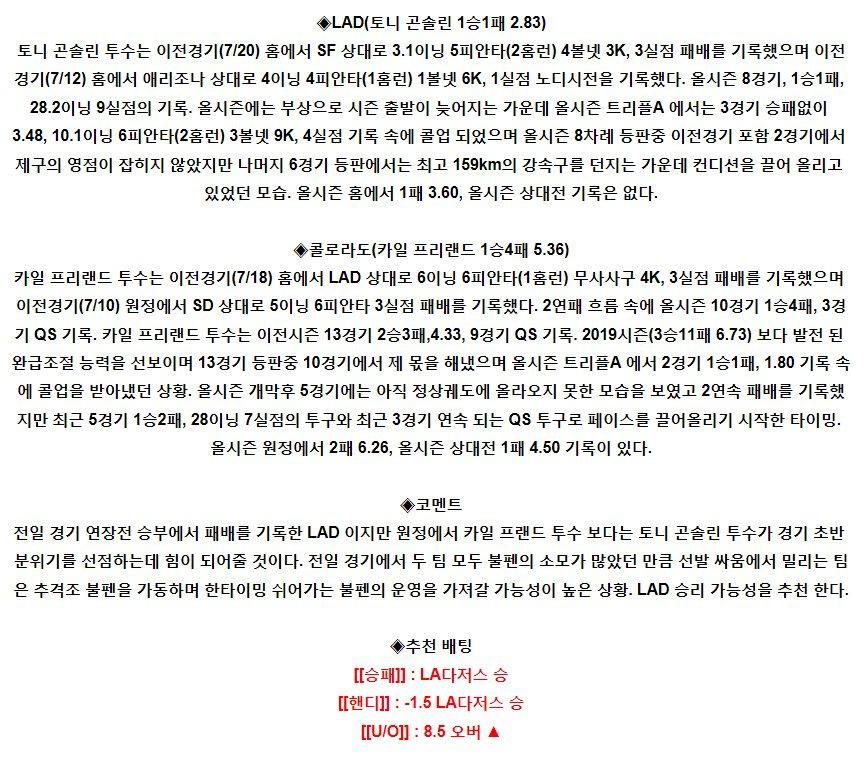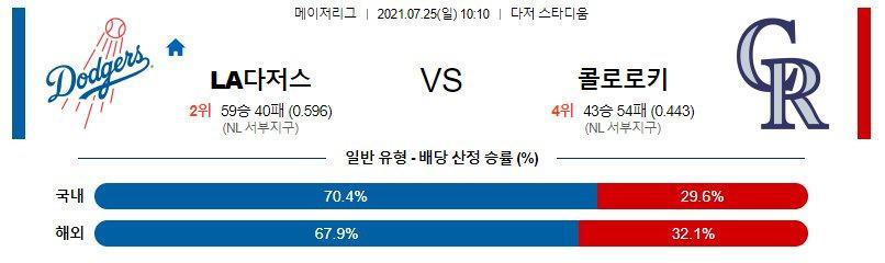 【MLB】 7월25일 LA다저스 vs 콜로라도 해외야구분석