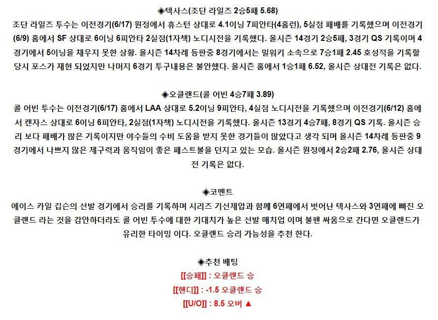 【MLB】 6월23일 텍사스 vs 오클랜드 야구분석