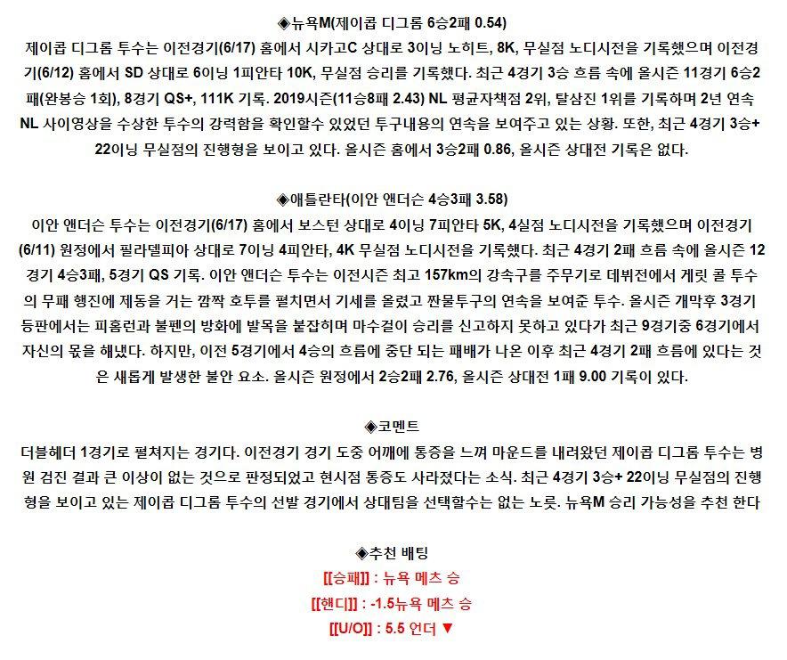 【MLB】 6월22일 뉴욕메츠 vs 애틀랜타 야구분석