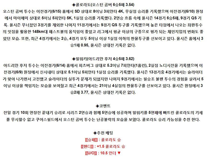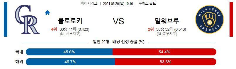【MLB】 2021년 6월20일 콜로라도 vs 밀워키 해외야구분석