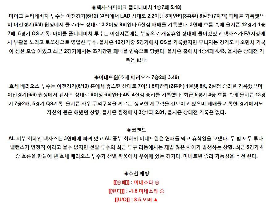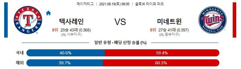【MLB】 6월19일 텍사스 vs 미네소타 야구분석
