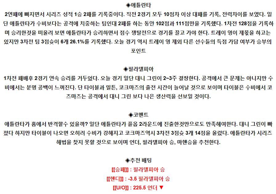 【NBA】 6월15일 애틀랜타 vs 필라델피아 해외농구분석