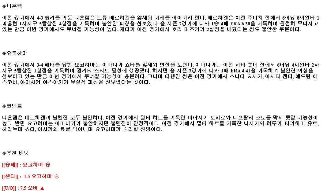 2021년6월13일 NPB 니혼햄 요코하마 해외야구중계