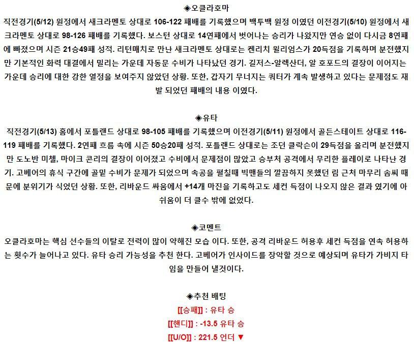 【NBA】 5월15일 오클라호마시티 vs 유타 해외농구분석