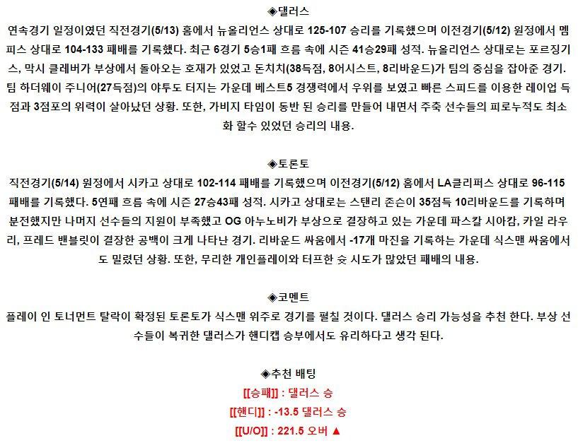 【NBA】 5월15일 댈러스 vs 토론토 해외농구분석