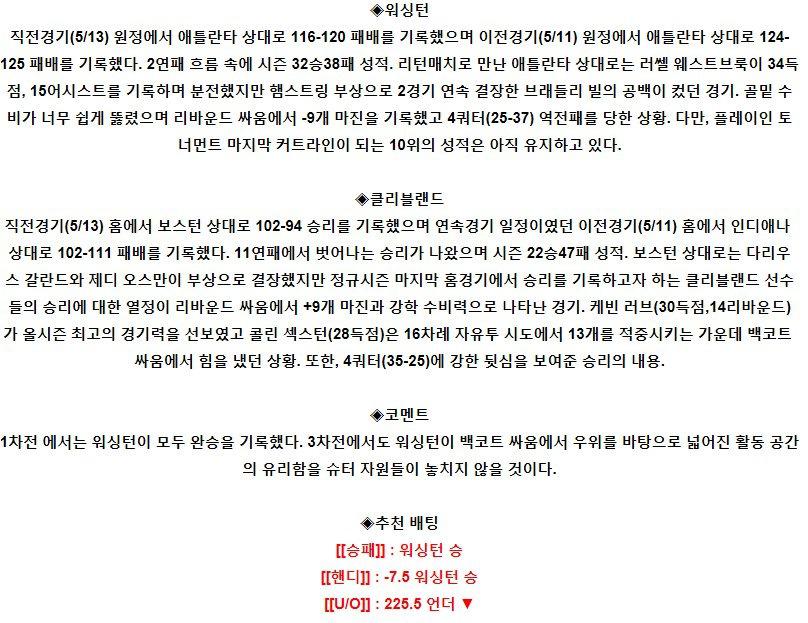 【NBA】 5월15일 워싱턴 vs 클리브랜드 해외농구분석