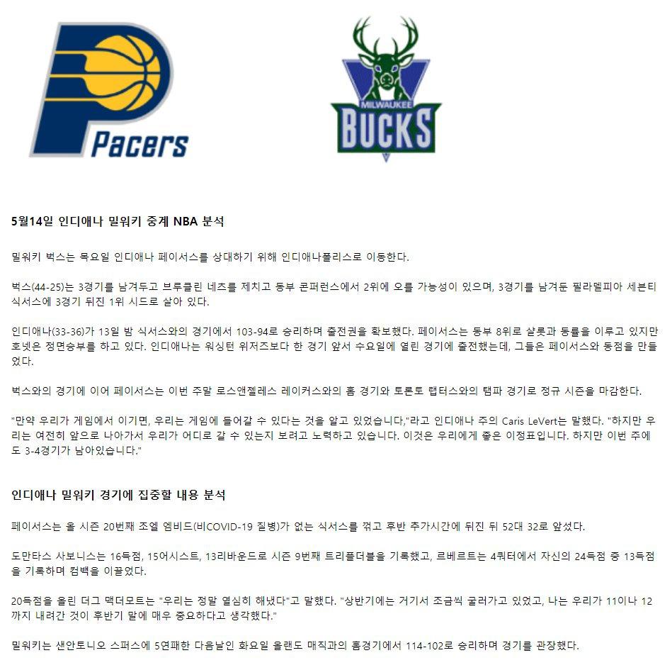 【NBA】 5월14일 인디애나 vs 밀워키 해외농구분석