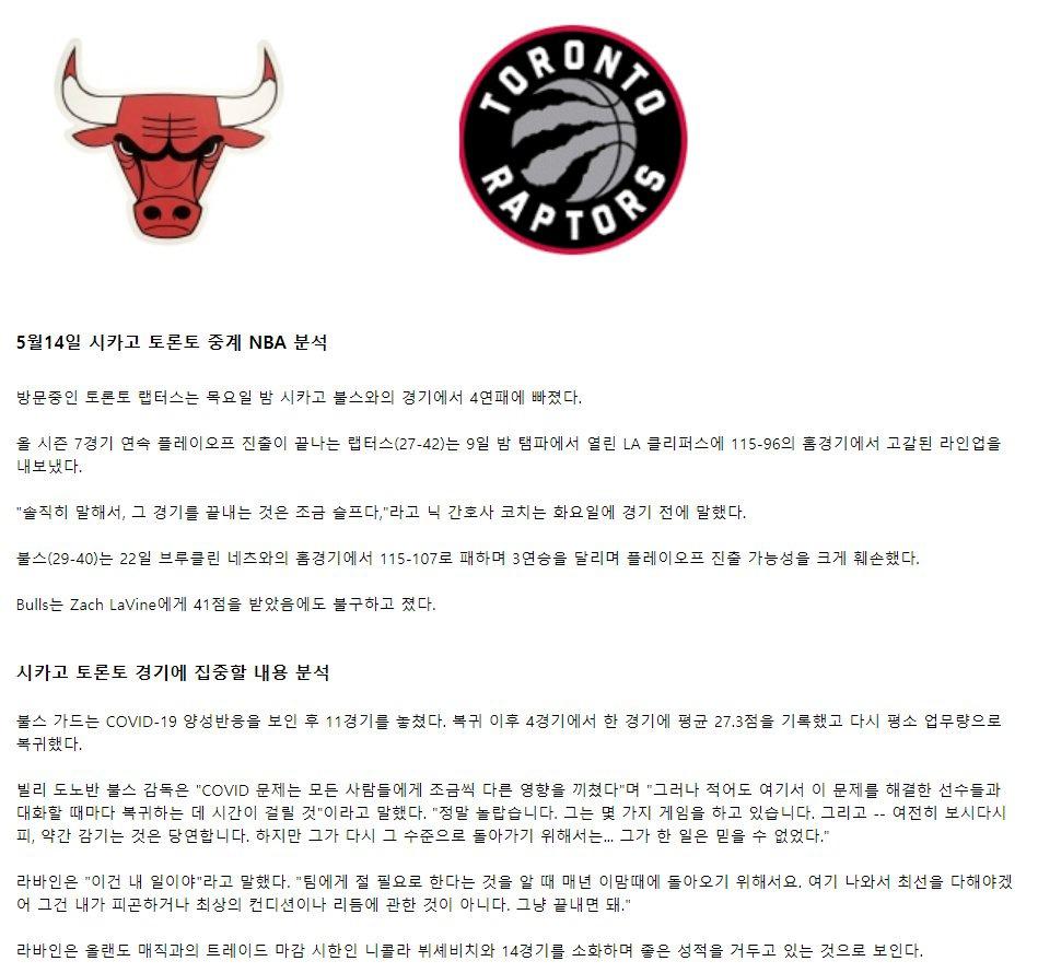 【NBA】 5월14일 시카고불스 vs 토론토 해외농구분석