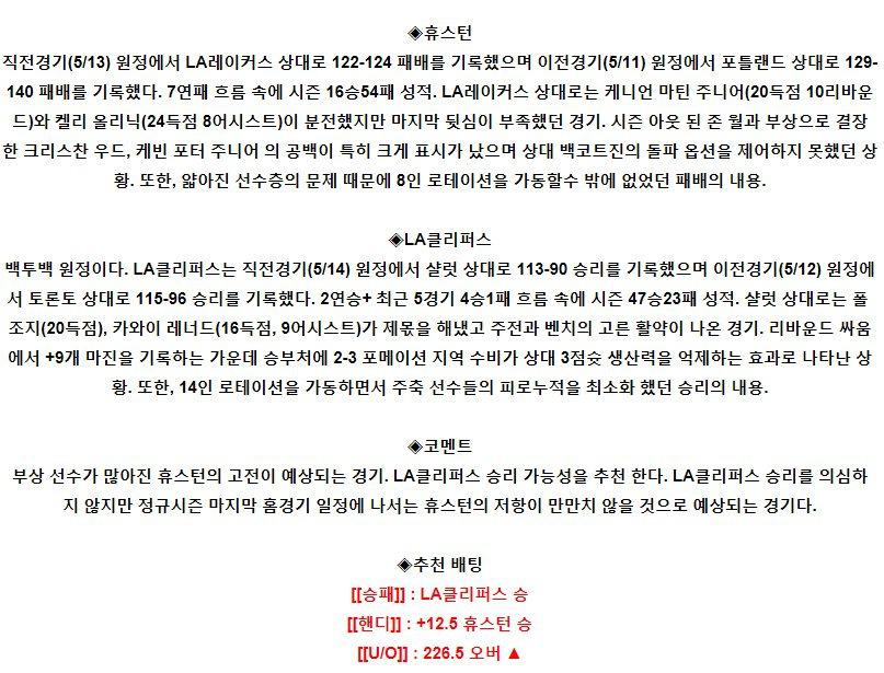 【NBA】 5월15일 휴스턴 vs LA클리퍼스 해외농구분석