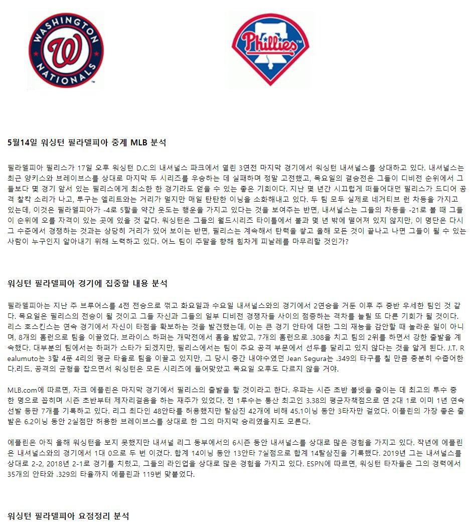 【MLB】 5월14일 워싱턴 vs 필라델피아 야구분석