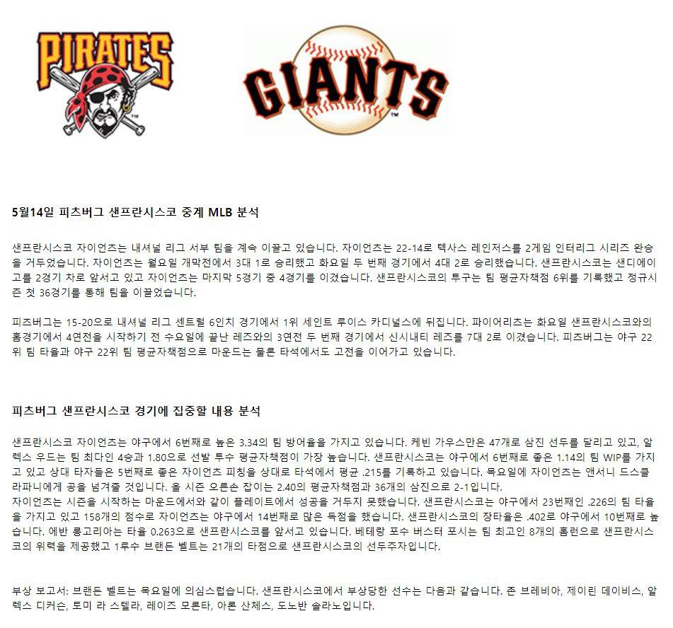 【MLB】 5월14일 피츠버그 vs 샌프란시스코 야구분석