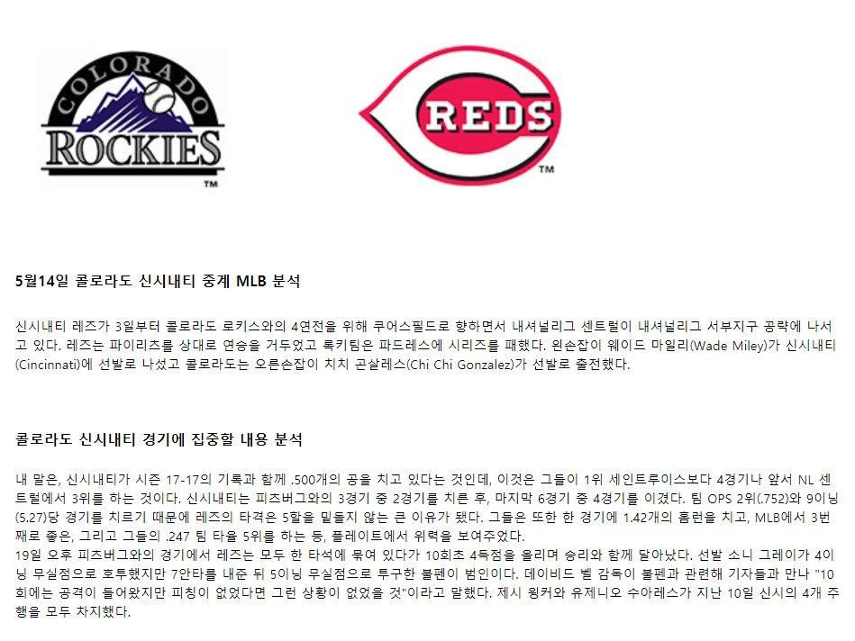 【MLB】 5월14일 콜로라도 vs 신시내티 야구분석