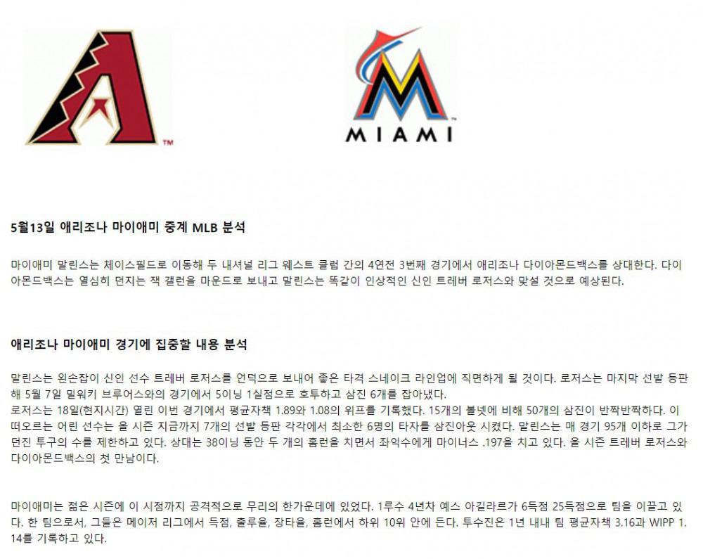 【MLB】 5월13일 애리조나 vs 마이애미 야구분석