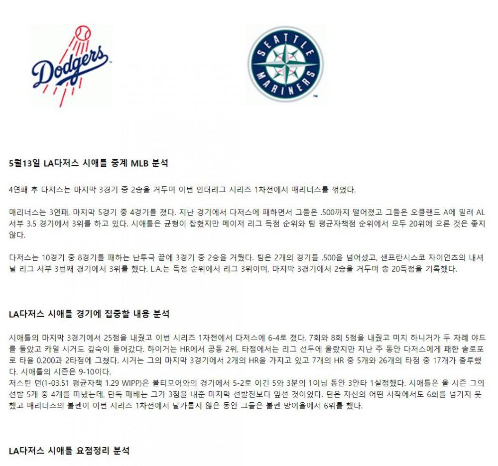 【MLB】 5월13일 LA다저스 vs 시애틀 야구분석