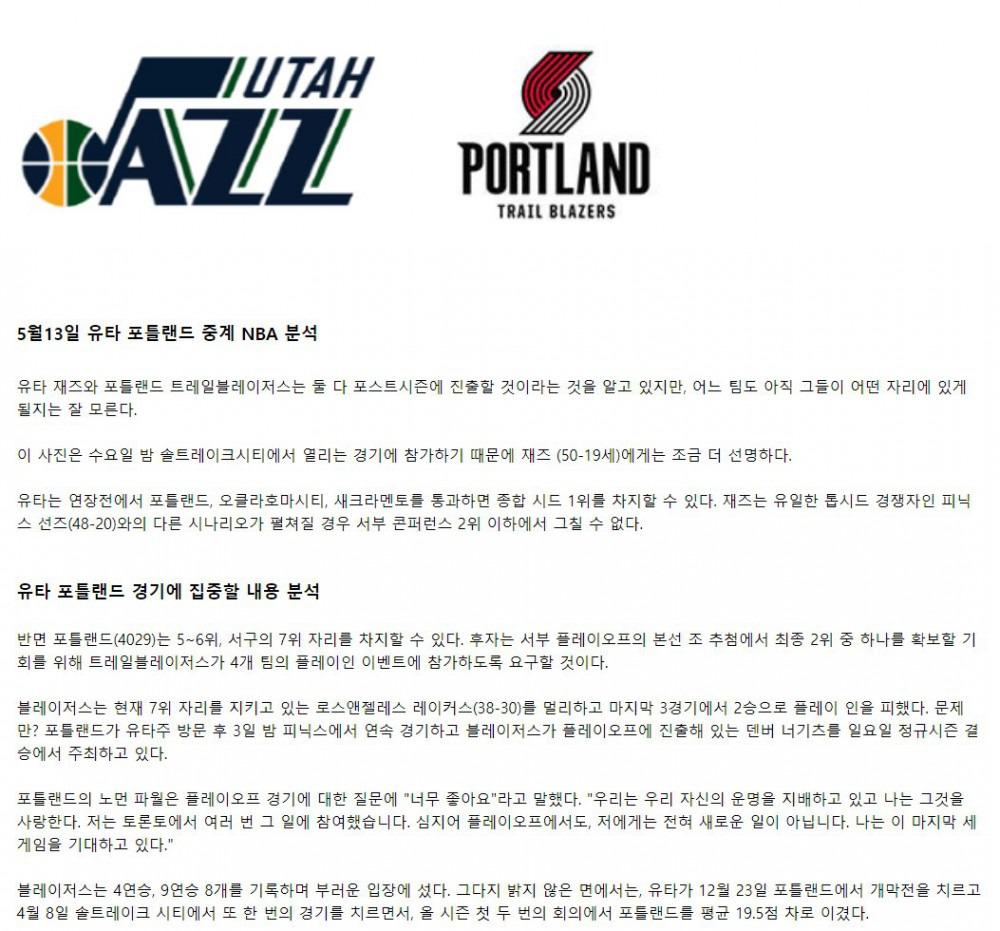 【NBA】 5월13일 유타 vs 포틀랜드 해외농구분석