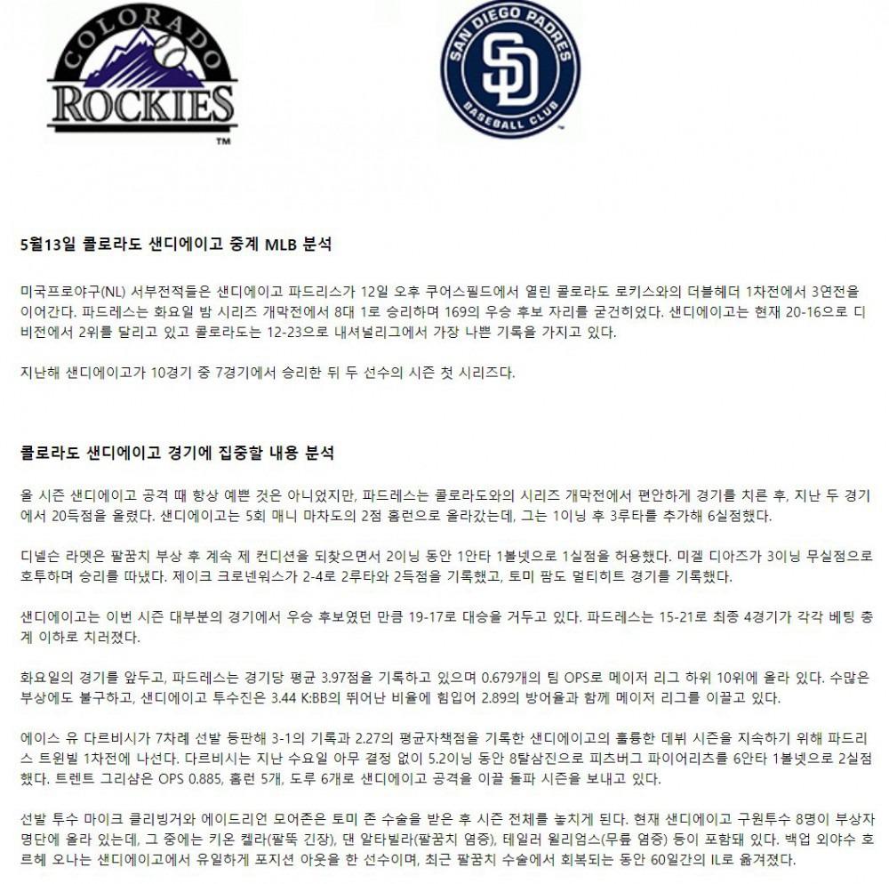 【MLB】 5월13일 콜로라도 vs 샌디에이고 야구분석