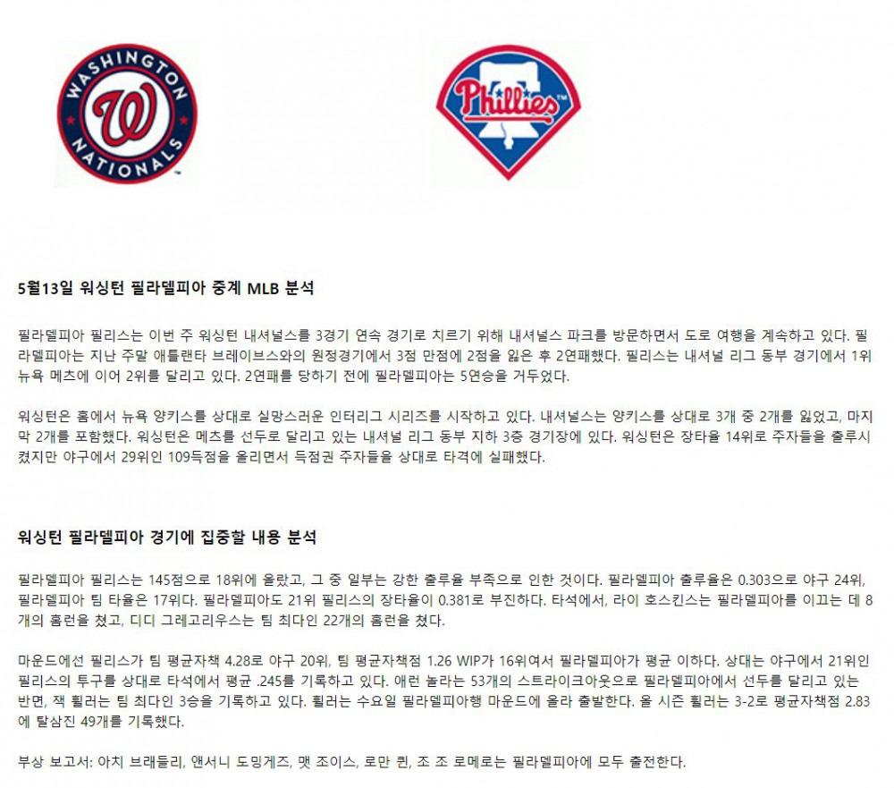 【MLB】 5월13일 워싱턴 vs 필라델피아 야구분석