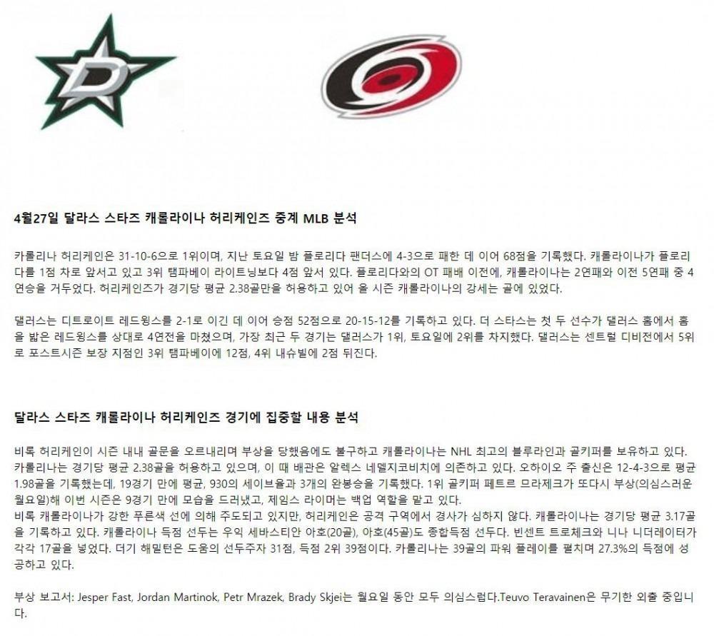 【NHL】 4월27일 댈러스 vs 캐롤라이나 하키분석