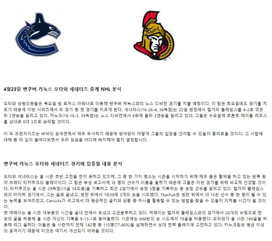 【NHL】 4월23일 벤쿠버 vs 오타와 하키분석