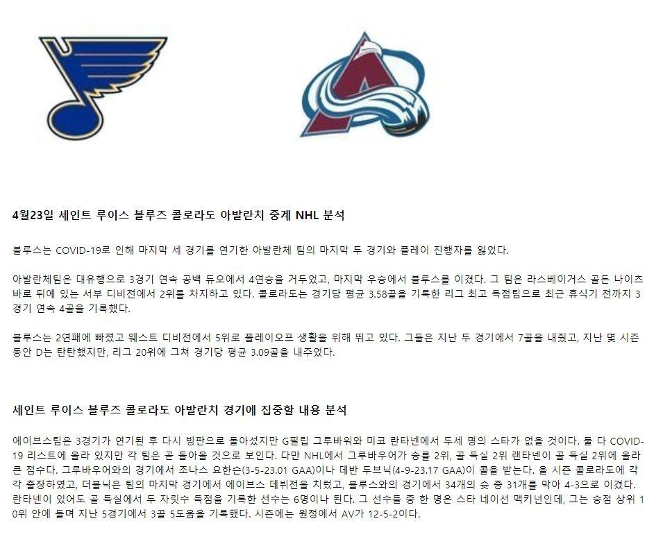 【NHL】 4월23일 세인트루이스 vs 콜로라도 하키분석