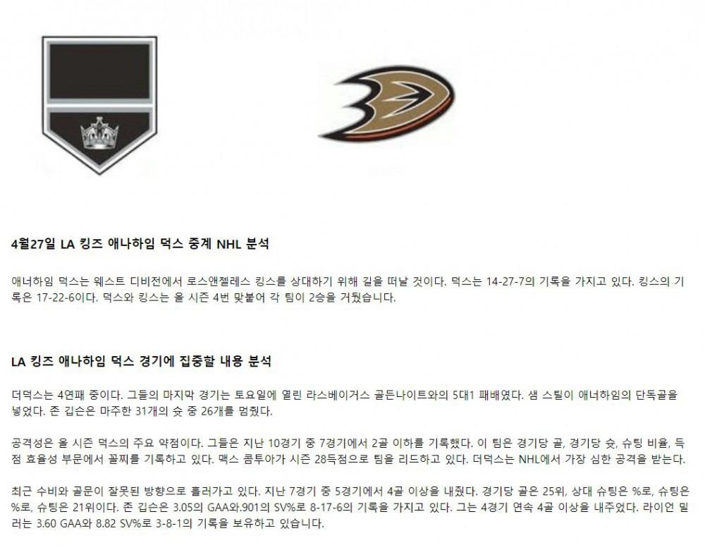 【NHL】 4월27일 LA킹즈 vs 애리조나 하키분석