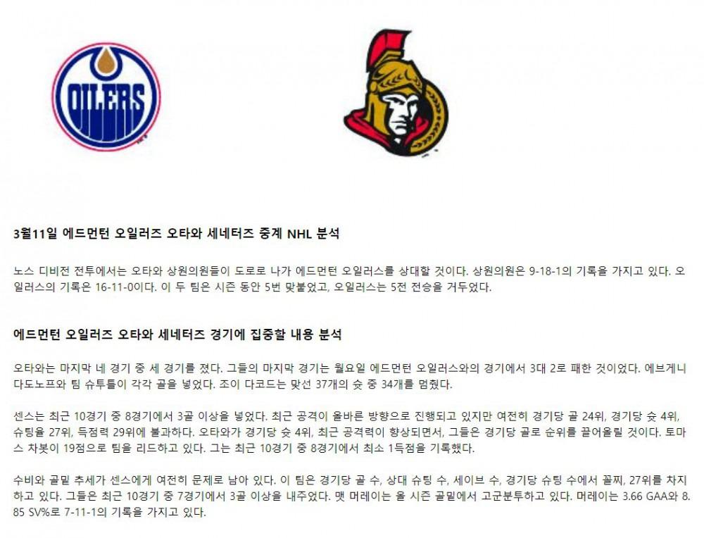 【NHL】 3월11일 애드먼턴 vs 오타와 하키중계 하키분석