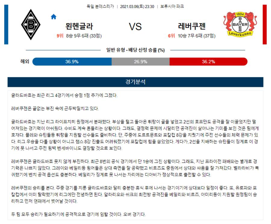 [분데스리가] 3월 6일 보루시아 묀헨글라트바흐 vs 바이어 04 레버쿠젠 경기분석