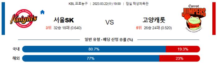 3월 22일 19:00 KBL 서울SK : 고양 캐롯 점퍼스